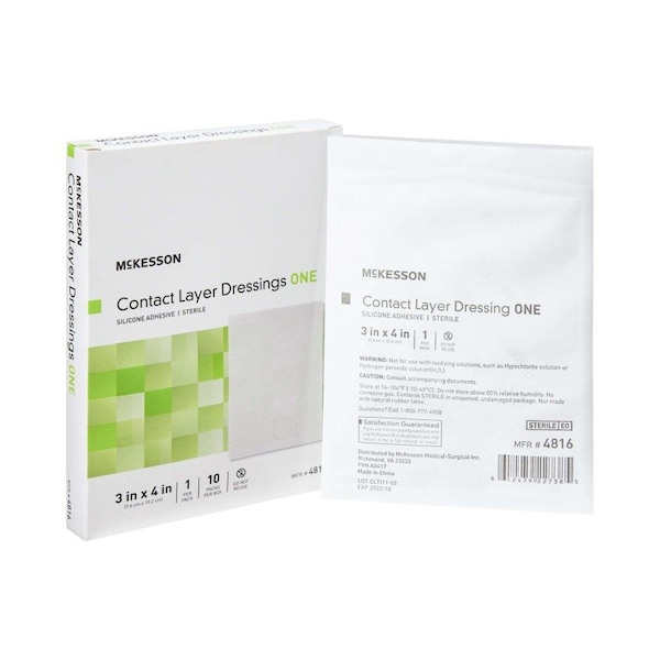 Wound Contact Layer Dressing McKesson 3 X 4 Inch Silicone Rectangle Sterile Designed for use on a variety of different wounds when used in conjunction with an outer absorbent dressing Suitable for use on skin tears, skin abrasions, blistering and lacerations, surgical wounds, partial thickness burns excluding third degree and leg and foot ulcers Can be used as a protective layer on superficial wounds that are not discharging and on areas of the skin that are very fragile