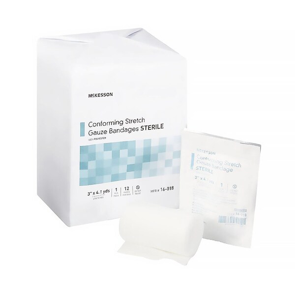 Conforming Bandage McKesson Polyester 3 Inch X 4-1/10 Yard Roll Shape Sterile Polyester design provides elasticity while retaining its shape and reducing slippage Breathable and absorbent for added comfort Low-linting formulation helps minimize the risk of fibers being left behind in the wound bed Stretch design conforms to the body's contours Finished edges help prevent unraveling 3 inches x 4-1/10 yards