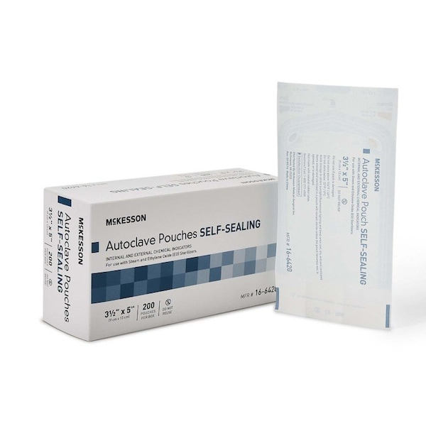 Sterilization Pouch McKesson Ethylene Oxide EO Gas / Steam 3-1/2 X 5 Inch Transparent Blue / White Self Seal Paper / Film For use with steam and ethylene oxide EO sterilizers Self-sealing, which makes pouches easy to open and close No autoclave tape necessary Internal and external chemical indicators Lead free ink 3 1/2 x 5 inches