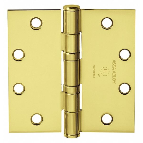 Butt Hinge, Steel, Bright Brass Finish, 150 lb Load Capacity, 3 Holes per Leaf, No Ligature Resistant, 270 Degrees Range of Motion, 3 1/2 in Door Leaf Height, 3 1/2 in Frame Leaf Height, 3 1/2 in Door Leaf Width, 1 7/16 in Frame Leaf Width, 0.123 in Door Leaf Thickness, 0.123 in Frame Leaf Thickness, Oil Impregnated Bearing Type, Square Corners, Yes Hardware, Features For Flush Door/Frame/Wall Applications