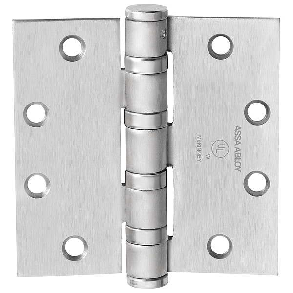 Butt Hinge, Steel, Satin Chrome Finish, 250 lb Load Capacity, 4 Holes per Leaf, No Ligature Resistant, 4 1/2 in Door Leaf Height, 4 1/2 in Frame Leaf Height, 4 1/2 in Door Leaf Width, 2 1/4 in Frame Leaf Width, 0.18 in Door Leaf Thickness, 0.18 in Frame Leaf Thickness, Oil Impregnated Bearing Type, Square Corners