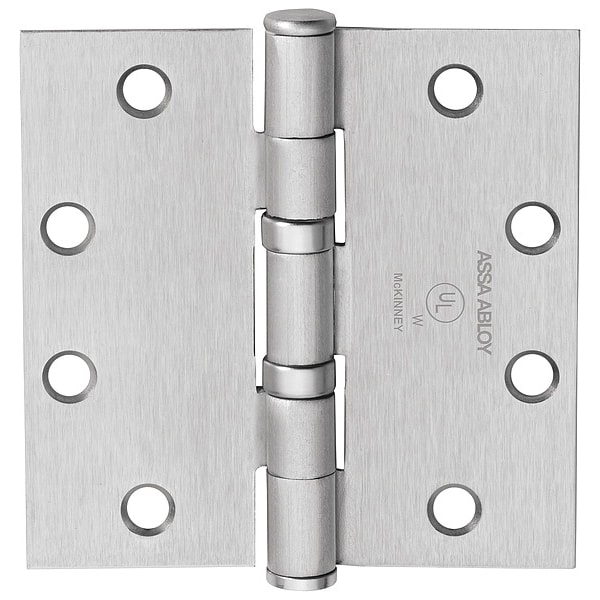 Butt Hinge, Steel, Satin Chrome Finish, 250 lb Load Capacity, 4 Holes per Leaf, No Ligature Resistant, 5 in Door Leaf Height, 5 in Frame Leaf Height, 4 1/2 in Door Leaf Width, 1 7/8 in Frame Leaf Width, 0.146 in Door Leaf Thickness, 0.146 in Frame Leaf Thickness, Oil Impregnated Bearing Type, Square Corners, Features For Flush Door/Frame/Wall Applications
