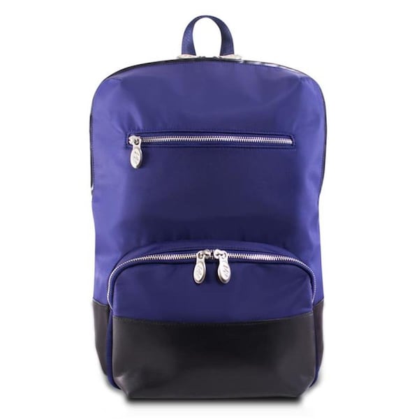 Elegant sleek nylon backpack with leather handle and accents. Fully-lined interior with leather accents. Exterior zippered compartment with inside pocket and top secure zipper pocket and silver accent hardware and metal zippers. Main compartment features dual tablet pocket with organizer for business cards pens and accessories. Secure interior full-length zipper pocket. Back nylon smart strap for piggy-backing onto rolling cases. Padded adjustable backpack straps with leather trim. Features -Tablet pocket -Smart strap Specifications - Color: Navy - Material: Nano Tech-Light Nylon with Leather Trim - Series: N Series - Design: Brooklyn - Dimension: 11 x 6 x 16.50 - Weight: 2.5 lbs