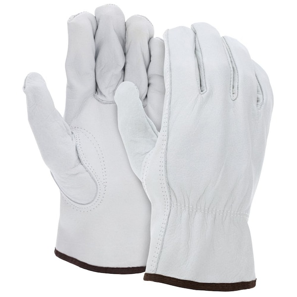 MCR Safety gloves, arm protection, medium size, grain leather palm, white, standard finger/keystone thumb style, slip-on/open cuff, ANSI heat level: 2.