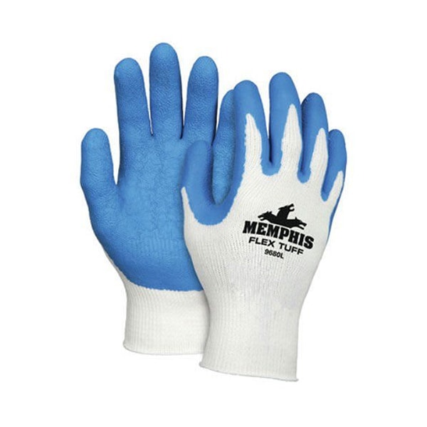 FlexTuff styles are manufactured on seamless knit liners that are flat dipped to reproduce the natural curved shape of the hand. As a result, workers benefit from less hand fatigue and greater productivity while performing detailed tasks to heavy duty jobs. The FlexTuff's strong 50% cotton/50% polyester shell and crinkle finish blue latex coating provides excellent protection in many applications.