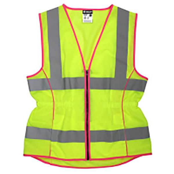 High-Visibility Vest, ANSI Class 2, Vest Size M, Traffic Safety Vest Color Yellow/Green, Fits Chest Size 49 in, Gender Women's, Stripe Color Silver, Vest Material Polyester, Vest Closure Type Zipper, ATPV Rating Not Applicable, Vest Stripe Color Family Silver, Back Stripe Pattern U, Number of Pockets (Inside) 2, Number of Pockets (Outside) 2, Number of Pockets with Closure 0, Features Comfortable, Formerly known as River City(R) Garments, Lightweight, Soft, Standards ANSI/ISEA 107-2020