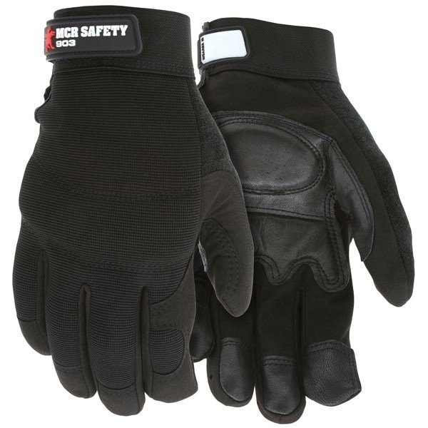Mechanics Gloves, Type: Mechanics; Material: Leather; Glove Size: Large; Color: Black; Cuff Style: Adjustable Closure; Lining: Unlined; Cuff Material: Elastic; Grade: Premium; Leather Cut: Grain; Leather Type: Goat - MCR Safety Mechanics Gloves Grain goatskin palm with foam padding Adjustable hook and loop wrist closure, Not just for the pit crew. MCR Safety mechanics gloves are constructed from an assortment of premium materials. Most styles feature Clarino or other synthetic leathers. Additionally, premium grain deerskin and goatskin styles compliment this series. The 903 features a premium synthetic leather palm and a grain goatskin patch with foam padding. The black color Spandex back hides dirt and offers extreme comfort. Multi-layered knuckle protection makes this a great choice., Premium synthetic leather palm Grain goatskin patch on palm with foam padding Adjustable hook and loop wrist closure Multi-layered knuckle protection Spandex back for comfortable fit