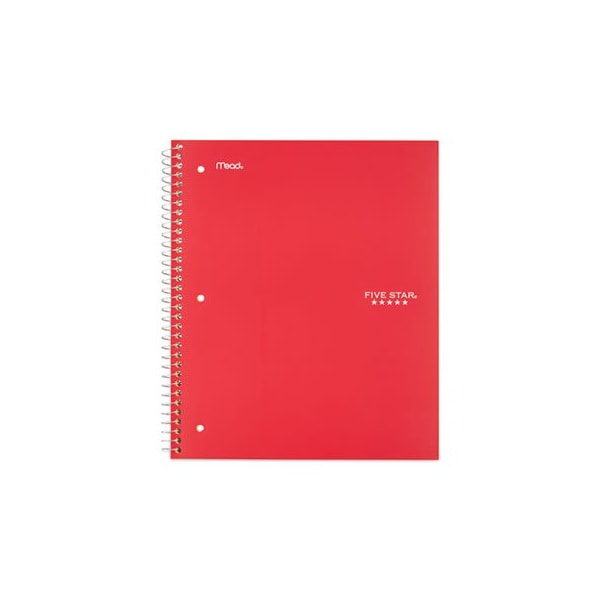 Last all year. assured! Durable, water-resistant poly covers protect your notes all year. Reinforced, tear-resistant divider pockets keep your loose sheets together. Spiral Lock wire binding prevents coil snag, and high-quality paper provides excellent ink-bleed resistance. Easily inserts into any three-ring binder sold separately. Further enhance your notetaking with the Five Star Study App that allows you to scan, study and organize your notes. Create instant flashcards and sync your notes to Google Drive to access them anywhere from any device. One-Subject FormatTwo pockets. Pocket-Sized Indicator: N; Book-Binding Type: Spiral Coil; Book-Binding Edge: Side; Cover Color: Red.