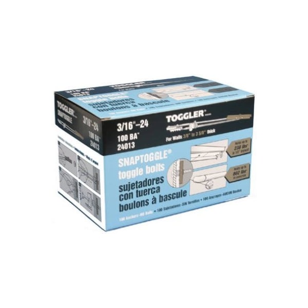 Toggler Snaptoggle, 100 Pack, 31624, BA Hollow Wall Anchors, Replace Old Fashioned Toggle Wings, Strongest Bolts Requires The Smallest Hole, Can Be PreInstalled Without Using A Bolt Won't Fall Behind The Wall When The Bolt Is Removed, Solid Metal Channel Centers The Bolt Which Cannot Sag, Will Not Damage Or Break Through The Wall Even Under Vibration