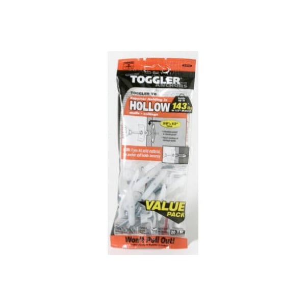 Toggler, 20 Pack, 3812, TB Hollow Wall Anchors With Screw, Patented Mechanism Provides Secure Holding Power For Light Medium Loads, Key Activated Locking Action Makes The Anchor A Rigid, Weight Distributing Truss In Hollow Walls, Providing Maximum Security In The Smallest Possible Hole, Can Be Used In Drywall Or Plaster Walls In Hollow Doors Or Thin Panels, Accepts Any Type Wood, Sheet Metal, Or Stainless Steel Size Of Screw From 6 Through 14