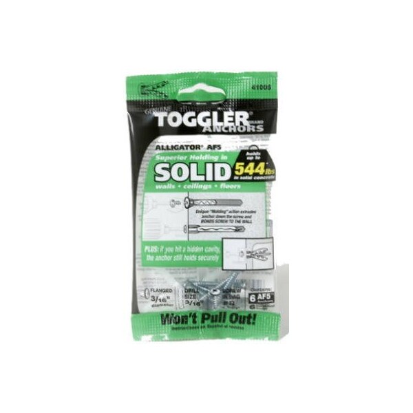 Toggler Alligator, 6 Pack, 316 Diameter, AF5 Flanged Solid Wall Anchors With 6 8 x 14 Screws, Versatile Easy To Install, Works In Any Building Material Many Different Sizes Types Of Screws Can Be Used With The Same Diameter Anchor, Replaces Plastic Plugs Screw Anchors, As Well As Metal Masonry Screws Wedge Anchors, Out Holds Metal Anchors Of Comparable Size For A Fraction Of The Cost, Special Corrosion Proof Polymer Absorbs Shock Vibration