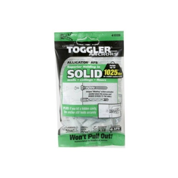 Toggler Alligator, 6 Pack, 516 Diameter, AF8 Flanged Solid Wall Anchors With 6 12 x 1 34 Screws, Versatile Easy To Install, Works In Any Building Material Many Different Sizes Types Of Screws Can Be Used With The Same Diameter Anchor, Replaces Plastic Plugs Screw Anchors As Well As Metal Masonry Screws Wedge Anchors, Out Holds Metal Anchors Of Comparable Size For A Fraction Of The Cost, Corrosion Proof Polymer Absorbs Shock Vibration