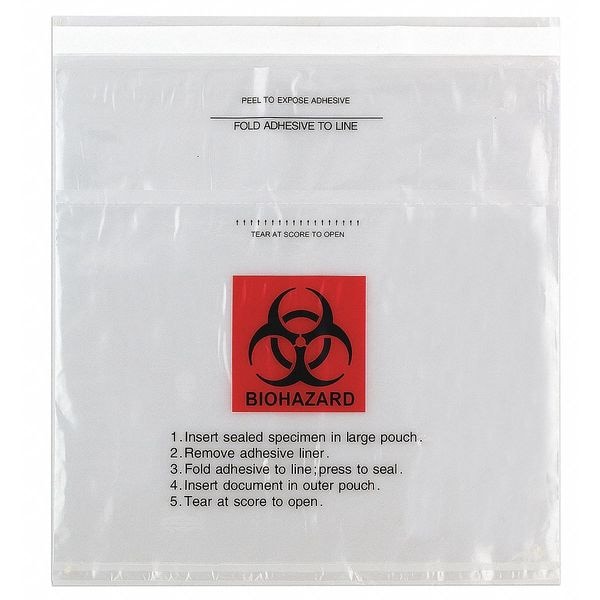 Specimen Transfer Bag, Thickness 1.75 mil, Color Clear, Material LDPE, Overall Height 10 in, Product Type Specimen Transport Bag, Overall Width 10 in, Autoclavable No, Sterile/Non-Sterile Non-Sterile, Legend Biohazard, Closure Type Adhesive, Strength Rating Not Rated, Bags per Roll/Pack 10, Package Quantity 1000