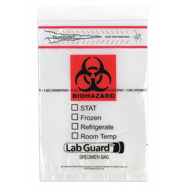 Specimen Transfer Bag, Thickness 1.75 mil, Color Clear, Material LDPE, Overall Height 9 in, Product Type Specimen Transfer Bag, Overall Width 6 in, Autoclavable No, Sterile/Non-Sterile Non-Sterile, Legend Biohazard, Closure Type Zipper, Strength Rating Not Rated, Bags per Roll/Pack 100, Package Quantity 1000