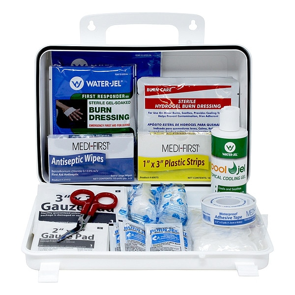 Burn Care Kit, Product Type Burn Care Kit, Application Welding; Food Service; Logging; Construction; Vehicle; Marine, industrial, Laboratory, Number of People Served 2, Number of Components 138, Number of Pockets 0, Adhesive Bandages Included (16) Bandages, Documentation Included Instruction Sheet, Wound Dressings Included (16) Plastic Strips, (3) Burn Dressings, (2) Gauze Rolls, (6) Gauze Pads, Tape, Elastic Bandage