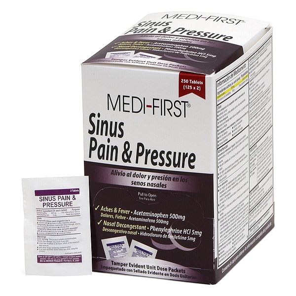 Sinus and Allergy Reliever, Purpose Nasal Decongestant, Pain Reliever/Fever Reducer, Exterior Package Type Box, Active Ingredient Phenylephrine HCl, Acetaminophen, Unit Dose Acetaminophen: 500 mg, Phenylephrine HCl: 5 mg, Number of Individual Doses 125, Dose Package Type Packets, Individually Dosed Individually Dosed, Strength Regular Strength, Flavor Unflavored, Format Tablet