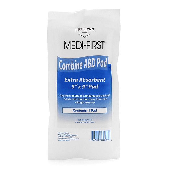 Trauma Dressing, Dressing Length 9 in, Dressing Width 5 in, Water Resistance Not Water Resistant, Sterility Sterile, Unitized Unitized, Fastener Included Fastener Not Included, Number of Units Included 1, Package Height 6 in, Package Width 2 1/2 in, Package Length 0 in, Compatible Manufacturer Part Number 16UMA, 16UPA, 24UMA, 24UPA, 36UMA, 36UPA, 700ANSI, 703ANSI, 733ANSI, 734ANSI, 738ANSI, 740ANSI, 745ANSI, 756ANSI, 768ANSI, 787ANSI, 807ANSI, 818ANSI, 821ANSI, 887ANSI