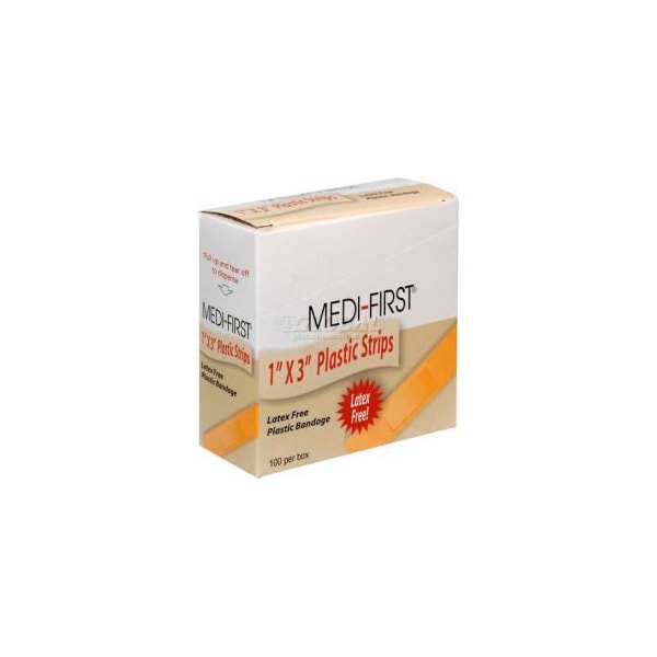 PLASTIC STRIP BANDAGE, 1" X 3" STRIP, 100/BOX ALL MEDI-FIRST BRAND BANDAGES ARE LATEX FREE AND OF THE HIGHEST QUALITY.