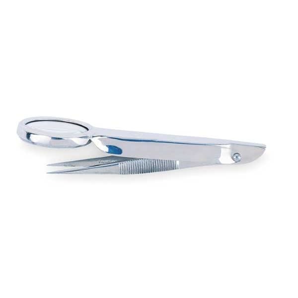 Splinter Tweezer, Color Silver, Length 4 in, Material Stainless Steel, Blade End Style Pointed, Handle Type Corrugated, Includes Magnifier