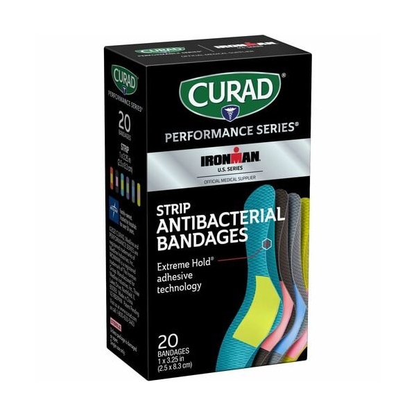 Part of the CURAD Performance Series, these Strip Antibacterial Ironman Bandages include a medicated absorbent pad with first-aid antiseptic. It helps prevent infection and protects cuts, scrapes or minor burns from dirt and germs. Nonstick pad won't disrupt the wound and features 0.8 percent benzalkonium chloride to help prevent infection. Extreme Hold adhesive technology with four-sided seal keeps the sterile bandage firmly in place and protects against dirt and germs. This extreme hold makes these bandages ideal to wear when active or playing sports. Durable, heavy-duty fabric offers outstanding protection for sports and active lifestyles. Rugged woven fabric conforms to body and flexes with movement. This product is intended for use on the body only.