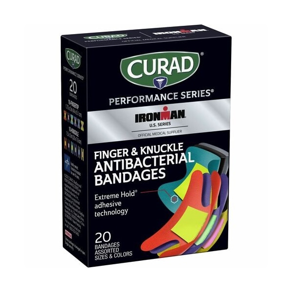 Part of the CURAD Performance Series, these Fingertip and Knuckle Antibacterial Ironman Bandages include a medicated absorbent pad with first-aid antiseptic. It helps prevent infection and protects cuts, scrapes or minor burns from dirt and germs. Nonstick pad won't disrupt the wound and features 0.8 percent benzalkonium chloride to help prevent infection. Extreme Hold adhesive technology with four-sided seal keeps the sterile bandage firmly in place on fingertips and knuckles to protect against dirt and germs. This extreme hold makes these bandages ideal to wear when active or playing sports. Durable, heavy-duty fabric offers outstanding protection for sports and active lifestyles. Rugged woven fabric conforms to body and flexes with movement. This product is intended for use on the body only.