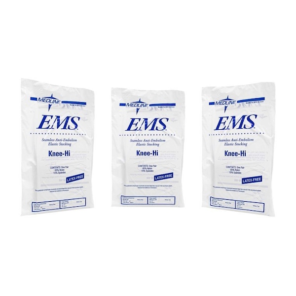 The 3 pack of size medium regular knee-high anti-embolism stockings provide mild 15-18mmHg compression that provides relief from minor to moderate swelling, aching, and varicose events. They have a tailored contoured fit with just the right amount of gradient pressure starting at the ankle and gradually reducing throughout the leg. It is made of 80% nylon and 20% spandex. Measuring tapes to assist in determining correct patient sizing are included in each box. Medline has developed a unique color code system for fast, positive product identification, and accurate patient fitting. Each package of stockings is identified and color-coded to correspond to one of the colors and sizes at the carton dispenser end. Size and order numbers are clearly labeled on each stocking. Color code: Calf Circumference: 13-15in. Leg Length: 15-17in.