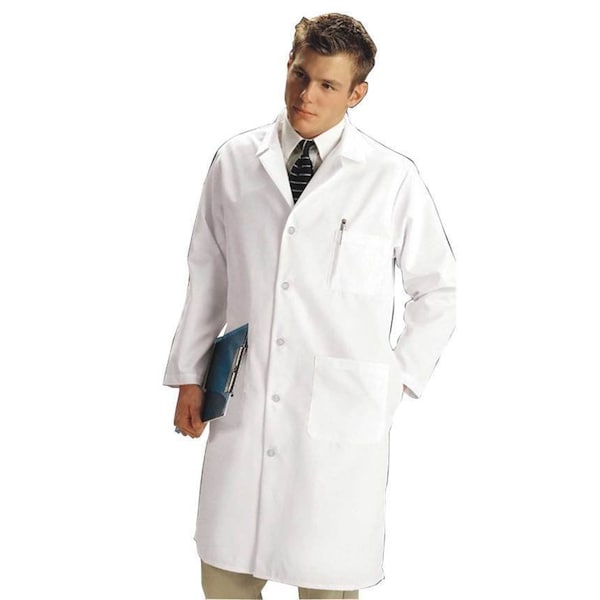 Easy care 80% polyester/ 20% cotton poplin fabric that's designed to resist wrinkles.. Button-front styling with two lower pockets, one chest pocket with pencil slot, and side vent openings for easy access to pants pockets, 43'' length.