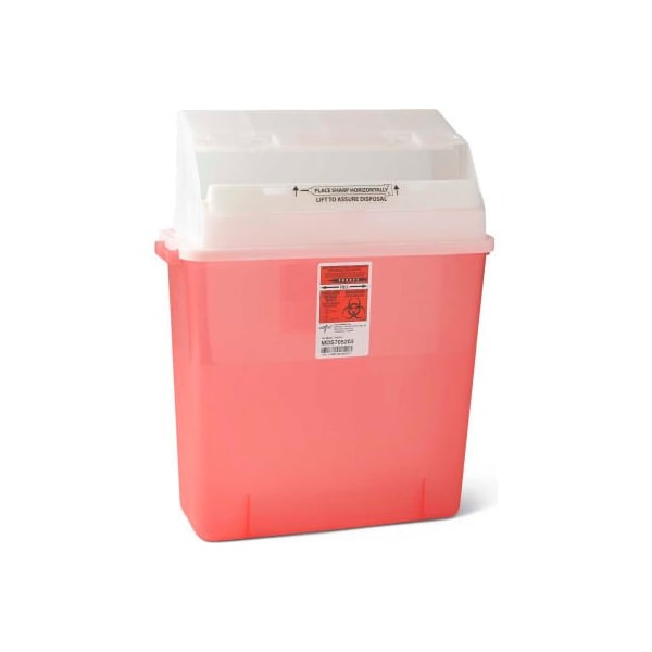Medline mds705203 biohazard patient room sharps containers, red, 3 gallon, 12/case these sharps disposal containers are designed for use in patient rooms, on med carts and in high traffic areas. features: the curved lid design of these containers facilitates 1-handed disposal horizontal drop design allows for maximum capacity to fill line each container locks for final disposal nestable containers save space and help reduce shipping costs fill levels are easy-to-see through translucent lid specifications: color: red container type: sharps/biohazard container counter balanced lid: yes latex free: yes lid compatibility: yes nested: yes product size: 12 quart size gallon: 3 gallon tortuous lid: yes