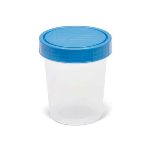 Medline or sterile specimen containers, packaged individually, 4.5 oz., 100/case features: or sterile graduations on polypropylene container are in oz and cc screw-on lid packaged individually in peel-pouches