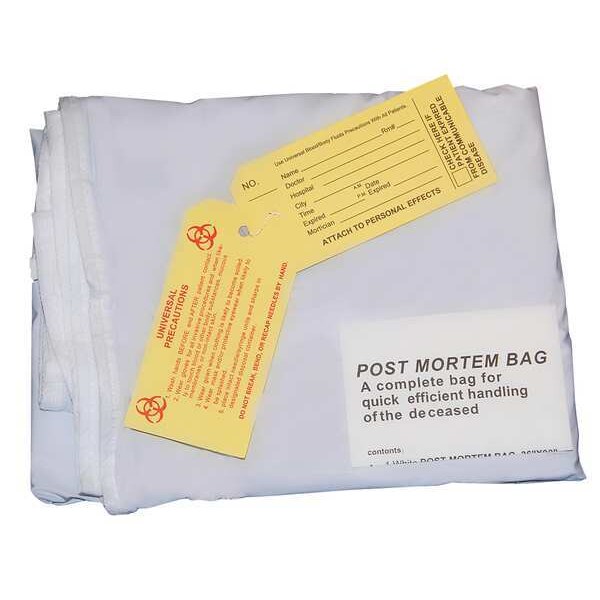 Body Bag, Length 90 in, Width 36 in, Thickness 7 mm, Height 1 in, Vinyl, White, Provides Storage or Transport for Deceased, Includes (3) ID Tags, Package Quantity 10