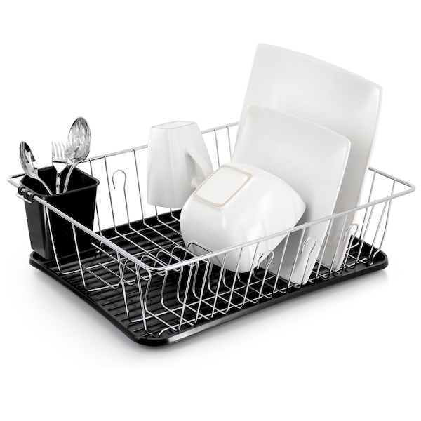 The Megachef 16 Inch Chrome Plated and Plastic Counter Top Drying Dish Rack in Black is a must-have addition to any home kitchen. This easy to assemble, chrome-plated, metal construction is sturdy enough to hold your dish and utensil collection and built to last. Its non-marring silicone coated feet protectors prevent any unwanted scratches on your kitchen counter top while the plastic tray collects water from the drying dishes. This rack also comes with an attachable cutlery holder to safely store sharp cutlery and flatware with ease. Add this essential kitchen accessory to your home!