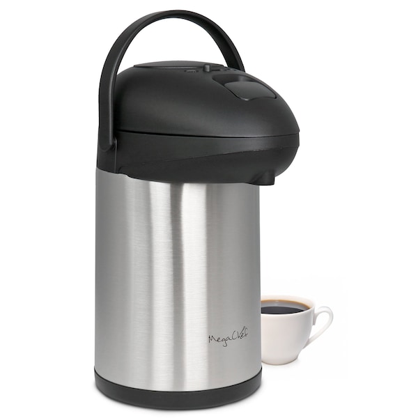 Upgrade your coffee and beverage area with this MegaChef 3.17 Quart Stainless Steel Vacuum Body Pump Cap Air Pot. The stainless steel insulated pot will keep your drinks perfectly hot or cold. Simply press down on the large button on top of the machine to have your drink dispensed or use the button lock feature to prevent accidental spills. A 360 degree swivel base and carrying handle makes this all the more easy and convenient to use and move around. To fill the air pot, just pop open the top and pour in your beverage. When it's time to clean, the pump shaft is removable for proper cleaning. This air pot is all you need for your coffee, hot chocolate, apple cider, and so much more in your office and home! Ideal for all types of gatherings such as large events, meetings, tailgates, barbecues, birthdays, and fundraisers.
