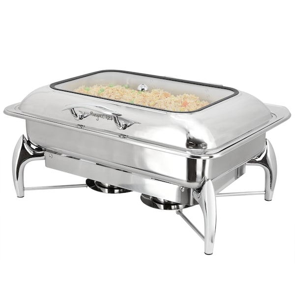 The MegaChef 9.5qt rectangular chafing dish is beautifully constructed with polished stainless steel that will elevate any buffet, gathering, or event you are serving for! With a generous 9.5-quart capacity, this chafing dish is designed to hold large quantities of food, making it ideal for serving a variety of dishes at once. The sleek, modern design adds a touch of sophistication to any buffet or dining setup, enhancing your presentation while keeping food at optimal serving temperatures. The included lid helps to retain heat and moisture, while the viewing window at the top displays your spread and allows you to check on food without letting in outside air. The fuel holders ensure consistent heating, allowing you to focus on your guests rather than your food. Transform your serving experience with the MegaChef 9.5 Quart Stainless Steel Rectangle Professional Chafing Dish. Perfect for weddings, parties, or corporate events, this chafing dish can accommodate a range of cuisines, from savory meats to delightful desserts.