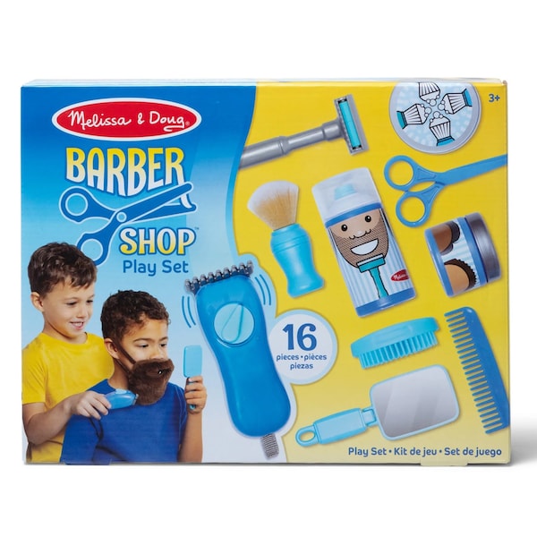 Cut, trim, shave, and style with pretend play shaving essentials for a trip to the barber! Style and pretend to trim a soft, wearable beard with adjustable straps. For a traditional shave, swirl squishy, textured shaving cream in a tub with a soft-bristled brush to pretend to lather up, then trim with play scissors. For a more modern shave, there's a pump shaving cream can, trimmers that vibrate when the tab is pulled no batteries required and a rolling razor for a ''smooth finish.'' Kids can check their look in the hand mirror that flips to stand as they finish with textured pomade in a tub, comb, and brush. Includes a reusable double-sided activity card. Engaging, pretend-play fun allows both boys and girls three and older to play the barber or the customer! Everything stores in a sturdy zippered shaving kit for easy cleanup.