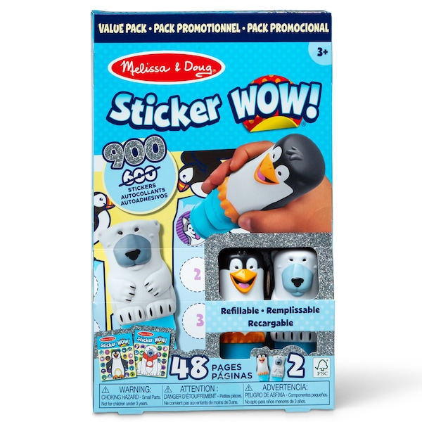 Melissa & Doug Sticker WOW! is a whole new way to play with stickers, and it's twice the fun with the winter-themed two-pack! Let the adorable, collectible Tofu the Polar Bear and Licorice the Penguin stamp, stamp, stamp their way through two 24-page pads of fun-filled, winter-themed counting, matching, and search-and-find activities - 48 pages in all! The refillable sticker stampers come pre-loaded with a sticker stack of 300 assorted stickers each, plus two bonus sticker stacks with 150 extra stickers in each. That's 900 stickers total! With 100 unique designs in every stack, each sticker is a surprise! Themed refill packs are sold separately and are compatible with any Sticker WOW! sticker stamper. Stickers are not reusable, but are easy to remove if necessary. Fill in the activity pages and use for creative art projects, such as bookmarks, posters, cards, and more. Easy-to-remove stickers and the convenient on-the-go activity pad format makes Sticker WOW! a great mess-free travel activity. Sticker WOW! patent pending promotes fine motor skills, encourages creative play, and it's satisfying, fidget fun! This product is certified by the Forest Stewardship Council. FSC certification ensures that products come from responsibly managed forests that provide environmental, social, and economic benefits, and that forests are protected for future generations. Please note that FSC certification applies to new inventory only FSC C156584.
