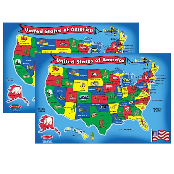 Geography comes to life with this cardboard floor puzzle, featuring 51 pieces cut to the shape of the state or region. 2' x 3' when assembled, the extra-thick pieces feature an Easy-Clean surface to keep them looking like new. Kids will have fun learning the states on this colorful, informative map puzzle. Sold as a pack of 2 identical puzzles.