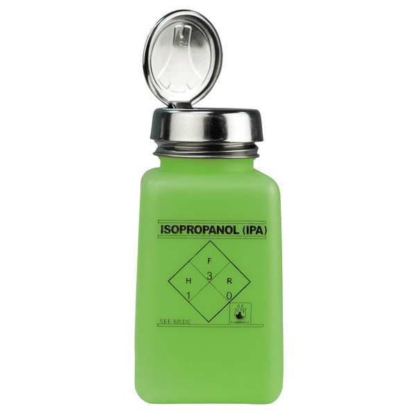 Graduated IPA Dispensing ESD Bottle, Body Color Green, Body Material HDPE, Body Diameter - Metric 53.98 mm, Bottle Type Dropper, Capacity - Metric 177.4 mL, Capacity - English 6 fl oz, Overall Height - Metric 106.7 mm, Clarity Opaque, Closure Included Yes, Closure Liner Material Polyethylene, Screw Closure Size 38-400 mm, Closure Color Silver, Mouth Size Wide, Autoclavable No, Graduated Yes, Sterile/Non-Sterile Non-Sterile, Pre-Cleaned None, Graduation Increments - Metric 25 mL
