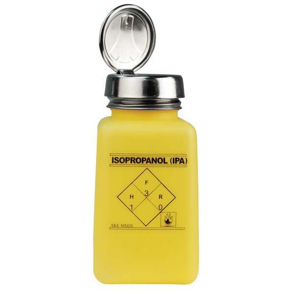 Graduated IPA Dispensing ESD Bottle, Body Color Yellow, Body Material HDPE, Body Diameter - Metric 53.98 mm, Bottle Type Dropper, Capacity - Metric 177.4 mL, Capacity - English 6 fl oz, Overall Height - Metric 106.7 mm, Clarity Opaque, Closure Included Yes, Closure Liner Material Polyethylene, Screw Closure Size 38-400 mm, Closure Color Silver, Mouth Size Wide, Autoclavable No, Graduated Yes, Sterile/Non-Sterile Non-Sterile, Pre-Cleaned None, Graduation Increments - Metric 25 mL