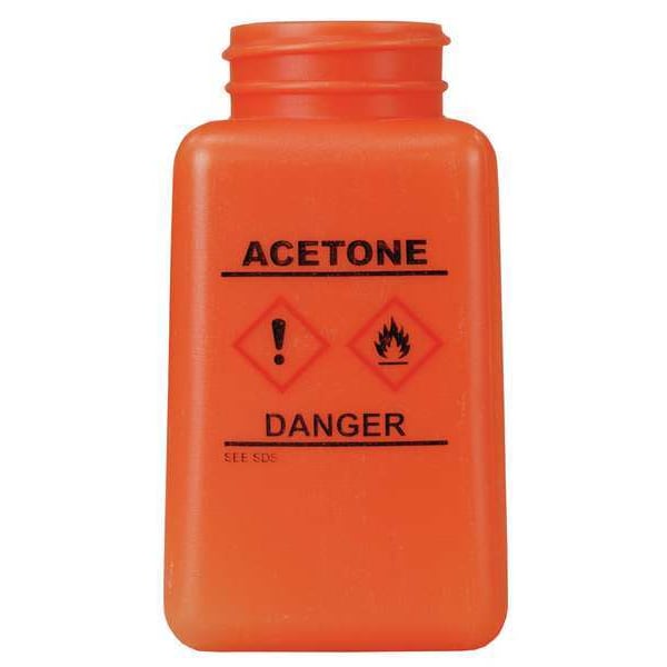 Graduated Acetone ESD Bottle, Body Color Orange, Body Material HDPE, Body Diameter - Metric 53.98 mm, Bottle Type Dispensing, Capacity - Metric 177.4 mL, Capacity - English 6 fl oz, Overall Height - Metric 101.6 mm, Clarity Opaque, Closure Included No, Screw Closure Size 38-400 mm, Mouth Size Wide, Autoclavable No, Graduated Yes, Sterile/Non-Sterile Non-Sterile, Pre-Cleaned None, Graduation Increments - Metric 25 mL