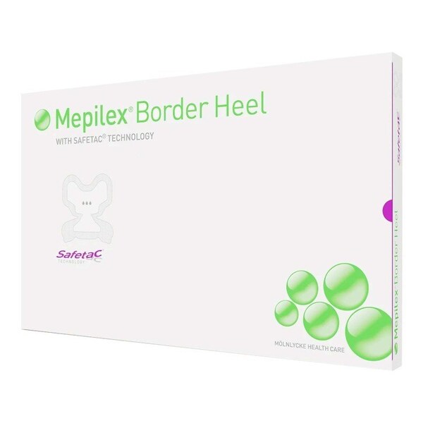 Foam Dressing Mepilex Border Heel 8-3/5 X 9 Inch With Border Film Backing Silicone Adhesive Heel Sterile Mepilex Border Heel is an all-in-one foam dressing specifically designed to fit the heel Its five-layer absorbent foam structure, with Safetac technology, effectively absorbs and retains exudate and maintains a moist wound environment Tan foam dressing with film backing is 22 x 23 centimeters