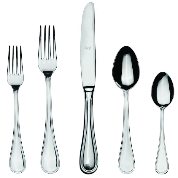 5 Pieces: 1 Table Fork, 1 Table Knife, 1 Dessert Fork, 1 Dessert Spoon, 1 Coffee Spoon