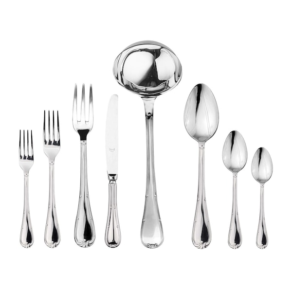 43 Pieces: 8 Table Fork, 8 Table Knife, 8 Fruit Spoon, 8 Fruit Fork, 8 Teaspoon, x1 Serving Spoon, x1 Serving Fork, x1 Ladle