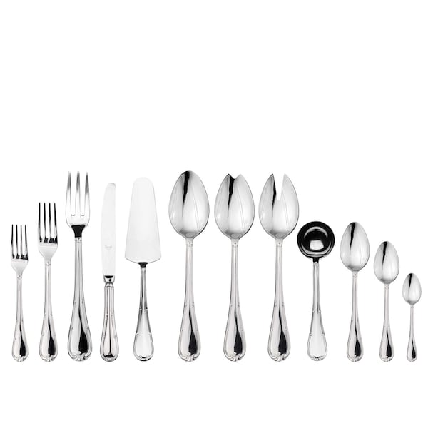 67 Pieces: 12 Table Fork, 12 Table Knife, 12 Fruit Spoon, 12 Fruit Fork, 12 Teaspoon, x1 Moka Spoon, x1 Serving Spoon, x1 Serving Fork, x1 Cake Server, x1 Salad Serving Spoon, x1 Salad Serving Fork, x1 Gravy Ladle