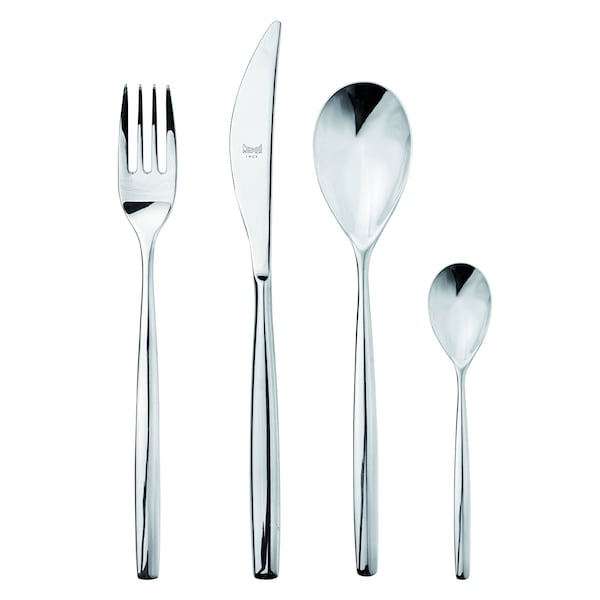 Studio Tecnico Mepra designed an elegant and refined model called Stiria. Elevate your dining experience with our premium utensils, featuring substantially thicker gauged stainless steel for unparalleled durability. The fork's precision-machined prongs ensure a lifetime of exceptional performance, while the knives' finely-tooled serration effortless cutting. And with the added convenience of being dishwasher safe, these utensils are a perfect blend of functionality and style.