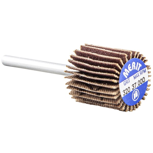 Flap Wheel, Abrasive Material Aluminum Oxide, Abrasive Type Coated, Backing Material Cotton, Backing Weight Y, Grit P320, Series R369, Flap Width 5/8 in, Maximum Operating Speed 37,000 RPM, Shank Size 1/8 in, Overall Diameter 5/8 in, Grade Fine, Shank Type Straight, Coating Coverage Closed, Resistance Properties Wear
