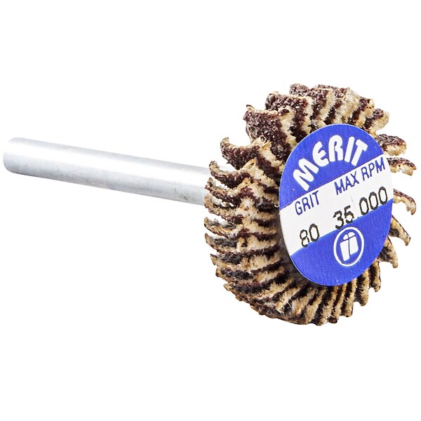 Flap Wheel, Abrasive Material Aluminum Oxide, Abrasive Type Coated, Backing Material Cotton, Backing Weight Y, Grit P80, Series R369, Flap Width 3/16 in, Maximum Operating Speed 35,000 RPM, Shank Size 1/8 in, Overall Diameter 3/4 in, Grade Coarse, Shank Type Straight, Coating Coverage Closed, Resistance Properties Wear
