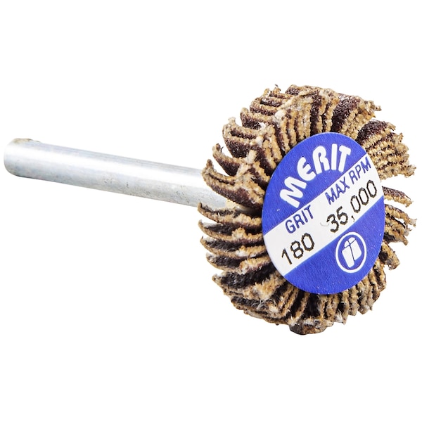 Flap Wheel, Abrasive Material Aluminum Oxide, Abrasive Type Coated, Backing Material Cotton, Backing Weight Y, Grit P180, Series R369, Flap Width 3/16 in, Maximum Operating Speed 35,000 RPM, Shank Size 1/8 in, Overall Diameter 3/4 in, Shank Type Straight, Coating Coverage Closed