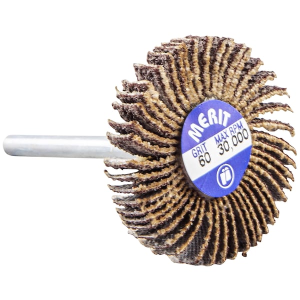 Flap Wheel, Abrasive Material Aluminum Oxide, Abrasive Type Coated, Backing Material Cotton, Backing Weight Y, Grit P60, Series R369, Flap Width 3/16 in, Maximum Operating Speed 30,000 RPM, Shank Size 1/8 in, Overall Diameter 1 3/16 in, Grade Coarse, Shank Type Straight, Coating Coverage Closed, Resistance Properties Wear
