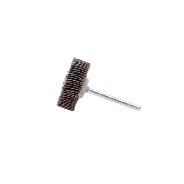 Flap Wheel, Abrasive Material Aluminum Oxide, Abrasive Type Coated, Backing Material Cotton, Backing Weight J, Grit P120, Series R369, Flap Width 3/8 in, Maximum Operating Speed 30,000 RPM, Shank Size 1/8 in, Overall Diameter 1 3/16 in, Grade Medium, Shank Type Straight, Coating Coverage Closed, Resistance Properties Wear