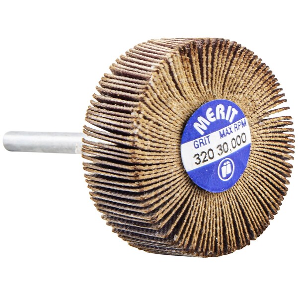 Flap Wheel, Abrasive Material Aluminum Oxide, Abrasive Type Coated, Backing Material Cotton, Backing Weight Y, Grit P320, Series R369, Flap Width 3/8 in, Maximum Operating Speed 35,000 RPM, Shank Size 1/8 in, Overall Diameter 1 3/16 in, Shank Type Straight, Coating Coverage Closed